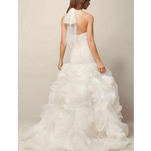 I will throw in matching veil as well as seen in picture. Soft white silk crepe mermaid gown with pleated accent on the bodice and hand pleated tumbled. Launched in february 2011, vera wang white is a line created by iconic bridal designer vera wang, exclusively for david's bridal stores. Full dramatic skirt with sequin organza and tulle flanges creates a stunning look. Dress bought in a uk size 14 and altered to fit a uk.